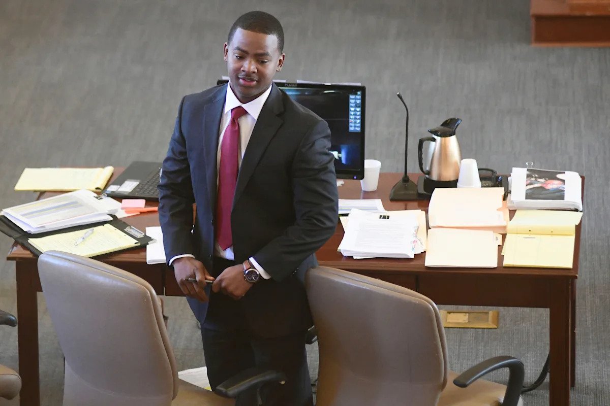 Archivo: Sheldon Timothy Herrington Jr., juzgado por un cargo de asesinato capital por la muerte del estudiante de la Universidad de Mississippi en 2022, Jimmie “Jay” Lee, mirando hacia la sala del tribunal durante la pausa del almuerzo, en Oxford, Mississippi, el 3 de diciembre de 2024. (Bruce Newman/The Northeast Daily Journal vía Ap, Pool, File)