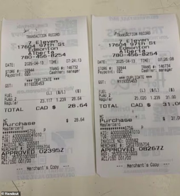 La pareja presentó dos recibos de 7-Eleven, que mostraban que pagaron aproximadamente $60 CAD entre los dos pagos mientras llenaban el depósito. Los recibos tienen una marca de tiempo en intervalos de dos minutos, de modo que el primer clic se cierra antes de que se llene el tanque.