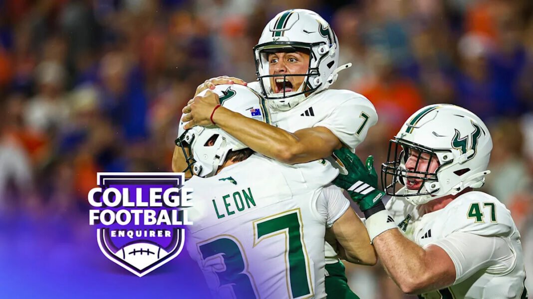 En la segunda mitad de un juego contra los Gathers de Florida en el estadio Ben Hill Griffin el 6 de septiembre de 2025, Nico Grammatika del sur de Florida Bulls #7 se celebró en septiembre de 2025. (Foto James Gilbert/Getty Image)