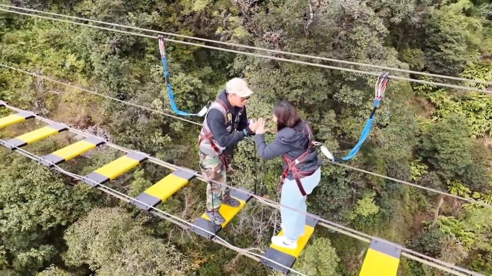 Un hombre llegó a alturas increíbles para hacer el trabajo, ofreciendo un puente de cuerda de 300 metros en el aire en Vietnam.